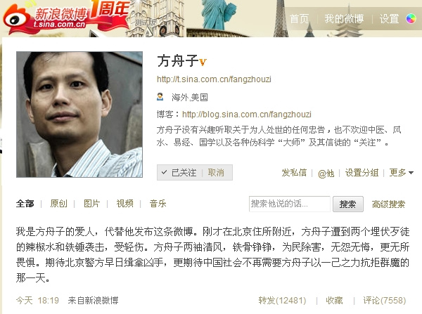 我是方舟子的爱人,代替他发布这条微博。刚才在北京住所附近,方舟子遭到两个埋伏歹徒的辣椒水和铁锤袭击,受轻伤。方舟子两袖清风,铁骨铮铮,为民除害,无怨无悔,更无所畏惧。期待北京警方早日缉拿凶手,更期待中国社会不再需要方舟子以一己之力抗拒群魔的那一天。