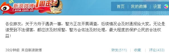 北京市公安局通过新浪微博称,正在调查方舟子遇袭案