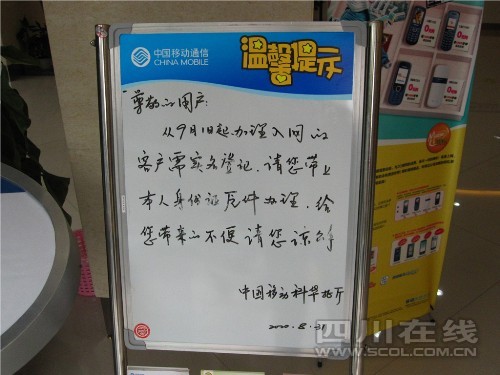 而在移动营业厅门口,记者看到一张告示牌,表明从今日开始,新入网的用户都需出示身份证才能办理。上午十点,记者在该营业厅看到,前来办理实名办理的用户已经有十几名,对于这样的新政策,他们均表示能理解。
