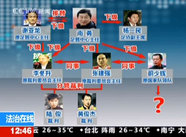 自上周末公安部证实前谢亚龙、李冬升和蔚少辉已被立案侦查之后,中国足协已有多人被抓。中央电视台在今天的新闻节目中,解析了“足协高官涉案”的“关系网”。