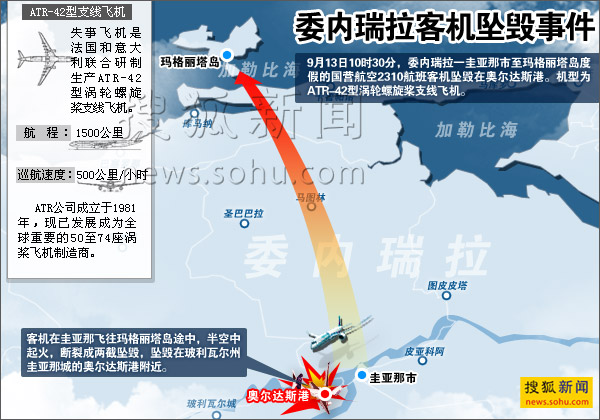失事的这架ATR-42型客机属于委内瑞拉航空工业和空中服务集团。客机是在飞往玛格丽塔岛(Isla Margarita)度假城市途中坠毁,坠机地点在玻利瓦尔州圭亚那城的奥尔达斯港附近,靠近一个钢铁厂。