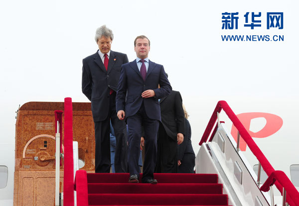9月26日,应国家主席胡锦涛邀请,俄罗斯联邦总统梅德韦杰夫抵达大连,开始对中国进行为期三天的国事访问。新华社记者 张铎 摄