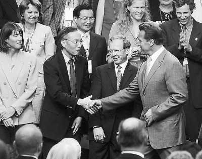 2005年6月1日,美国加州州长施瓦辛格出席“加州的未来”演讲会,与美籍华人科学家朱棣文(前排左二)握手。贾国荣摄