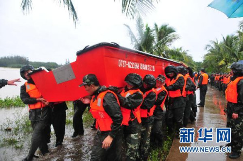10月7日,海南武警总队一支队战士徒手运送冲锋舟至三江农场。