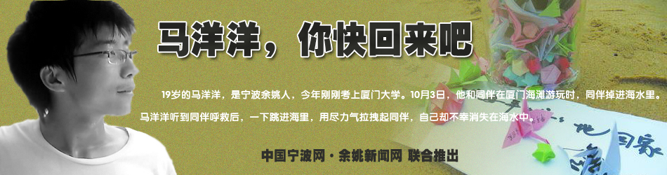 “马洋洋,回家!”“马洋洋,你一定会回来的,对吧!我们在余姚等你回来……”昨日已是马洋洋出事的第8天,离生还的希望越来越渺茫,但他的家人仍没有放弃搜救。下午,余姚中学在厦大的2010级校友将承载着母校师生祝福的漂流瓶,轻轻投入大海,继续为马洋洋祈福。