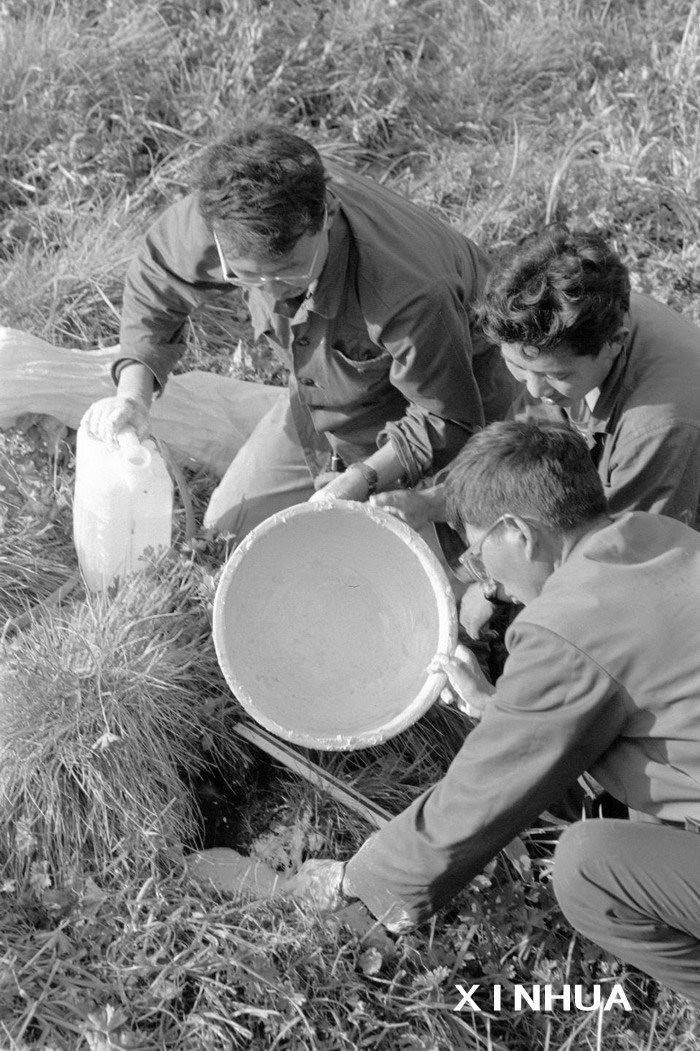 在神农架海拔二千多米的半壁岩地方,考察队员发现一个可能是“野人”的脚印,他长达四十公分。图为考察队员正在浇灌脚印的石膏模型。
