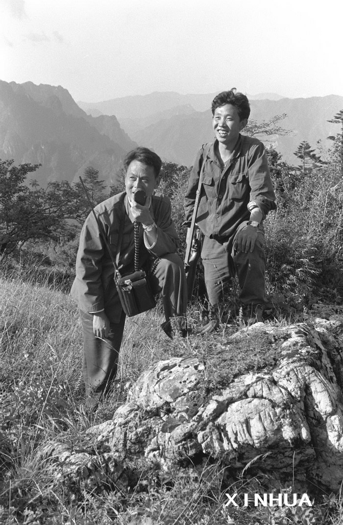 考察队员在海拔二千多米的高山上考察时,互相用步话机通讯联络。