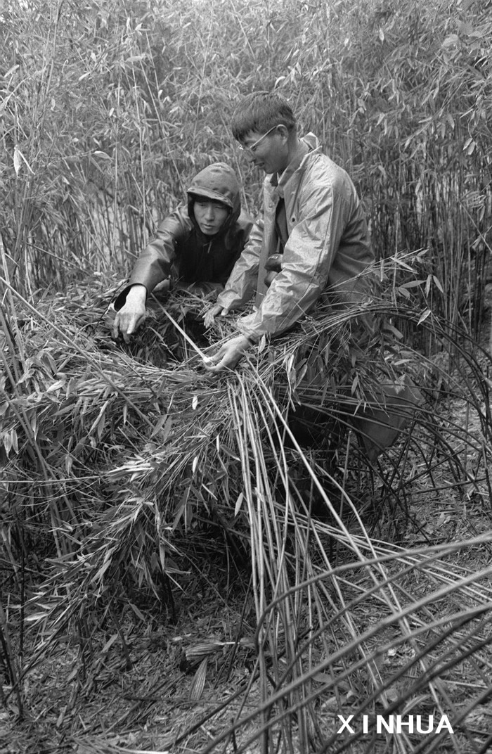 考察队副队长刘民壮(右)和队员于工(左)在海拔二千多米高山的竹丛中,冒雨对这个“巢穴”进行测量并采集现场资料。