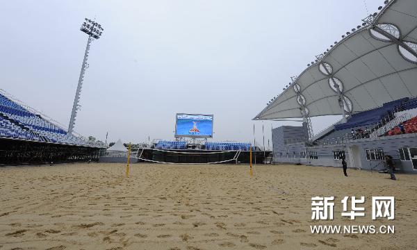 这是10月9日拍摄的广州亚运会沙滩排球场的比赛场地,其8000吨比赛专用沙产自广东省茂名市。广州亚运会沙滩排球场位于广州亚运城东部的亚运公园内,占地面积36400平方米,永久建筑总面积2558平方米。主比赛场由西侧主看台和东南北侧临时看台组成,赛时可提供3006个座席。亚运城沙滩排球场意在创造与自然和谐共生的建筑形态。白色的膜结构似风帆漂浮在宽阔的江面,椭圆的建筑外表似明珠镶嵌于亚运公园。在椭圆形围栏上悬挂种植着当地植被的花架,营造出具有岭南特色的绿篱效果,使得场馆由内而外,处处渗透绿色的气息。新华社记者卢汉欣摄