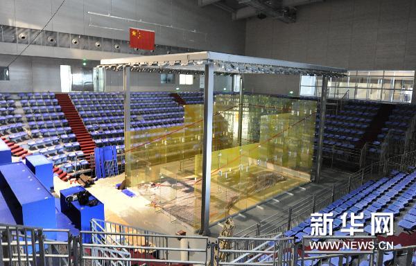 这是10月9日拍摄的正在建设中的广州亚运城综合体育馆壁球馆。广州亚运城综合体育馆包括体操馆、台球壁球馆及广州亚运历史博物馆。该项目建设用地面积101086平方米,总建筑面积65315平方米,是广州亚运会规模最大的新建场馆。亚运期间承办的比赛项目为体操、艺术体操、蹦床、台球、壁球。赛后将改建为广州亚运新城,集体育、商业、公共服务等多功能于一体的建筑综合体及城市休闲广场,服务于市民。综合体育馆的体操馆设固定观众席位6233个,赛后可改造为8000座篮球馆,功能设计具有多种灵活性。广州亚运城综合体育馆的设计灵感来源于体操运动员手中五彩斑斓的彩带,这个建筑蓝灰绿色的幕墙外形和曲度优美的不锈钢金属屋面极具现代理念,旋律般流动的屋顶、炫目而流畅的建筑形态,充满力量、速度和技巧的动感,从不同角度都呈现出独特的景观。新华社记者卢汉欣摄