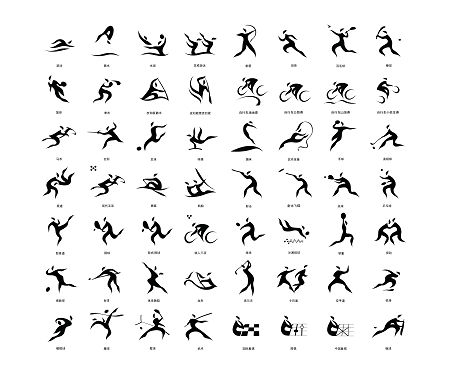 跳跃的火焰,灵动而飘逸,展示出生命的力量。广州亚运会体育图标的创意灵感源自亚运圣火。标志设计以柔美流畅的线条勾勒出56个体育项目的基本轮廓,仿佛56位拥有健美身躯的“火人”,展现出鲜明的运动特征和优雅的运动美感。“火人”象征着体育健儿如同一团团熊熊的火焰,在亚运会的大舞台上,燃烧生命的激情和梦想,冲破重重障碍,挑战运动极限。体育图标设计延续了火焰的概念,与亚运会会徽“五羊圣火”相映衬。