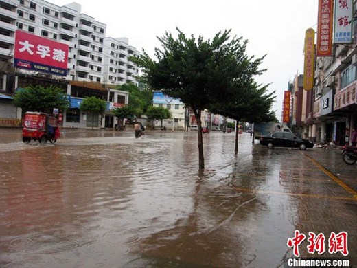 10月16日早晨,海南侨乡文昌遭一夜大雨袭击后,文城镇文新路等路段再积水。至9月30日以来,遭遇百年不遇强降雨洪涝灾害的文昌市,天气放晴雨5天,15日中午起再一度降大雨。中新社发 付美斌 摄