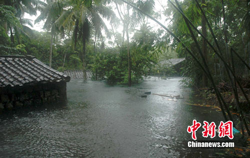 新一轮强降雨海口农村灾情加剧,海口龙塘镇30个村庄被淹。图为富道村许多房屋已泡入水中。