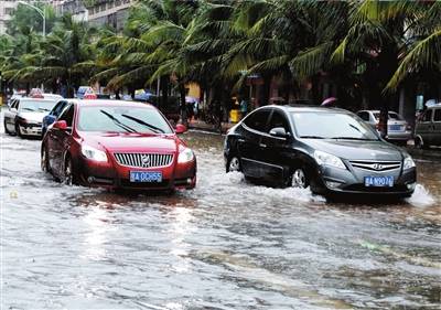 ①17日,海口市三西路严重积水,车辆缓慢前行。