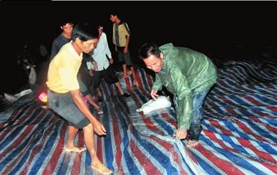 ②16日晚间,海南陵水县隆广镇基层党团员加固堤坝,奋战在抗洪一线。
