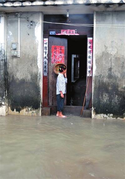 17日下午,在海口市灵山镇儒萃村,村里一条排水沟中的水已漫出,积水没过小腿,多名村民家中被淹。村民朱立春说,自己家的粮仓也被水淹了,只好把粮食全搬进客厅。“家里孩子还小,只能把婴儿床用砖头垫起来,怕水进入卧室把床淹掉。”