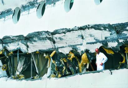 靠近观察,邮轮右侧船体的中部,有一道约30米长、2.5米高的巨大裂口。目测裂口的最深处,侵入船体约有50厘米。这道裂口横向波及了船舱第五层的11个圆形舷窗,从破损处可明显看到舱内家具、变形的钢板和外露的阻燃材料,这也意味着,撞击发生时,邮轮上的至少11间客房(每间客房有一个舷窗)被撞破。
