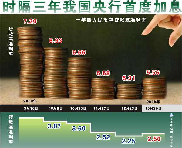 中广网北京10月20日消息(记者梁盛)据中国之声《新闻纵横》报道,昨晚(19日)18时59分,中国人民银行在网站上发布消息说,自2010年10月20日起上调金融机构人民币存贷款基准利率。其中,金融机构一年期存款基准利率上调0.25个百分点,由现行的2.25%提高到2.50%;一年期贷款基准利率上调0.25个百分点,由现行的5.31%提高到5.56%;除活期存款利率未调整外,其他各档次存贷款基准利率均相应调整。
