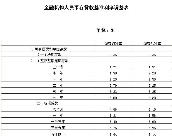 存贷款基准利率上调0.25个百分点 时隔3年后首度加息