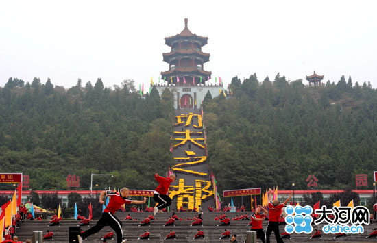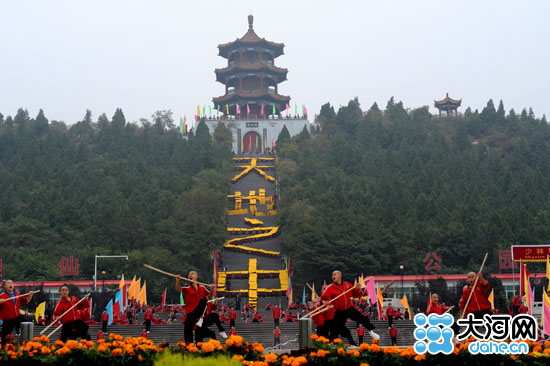 据了解,按照组委会相关安排,迎宾式把少林寺、中岳庙、嵩阳书院作为3个点,旅游公路作为一条线,为充分展示少林武术的博大精深,展示少林武术发源地的人文景观和精神面貌,组委会安排从登封市迎仙公园开始至少林寺景区的沿途近20公里的路途中,安排了6万余名武校学员沿途表演少林功夫,其中塔沟武校的13000余名学员分别在迎仙阁广场和少林寺景区进行大型文艺表演。
