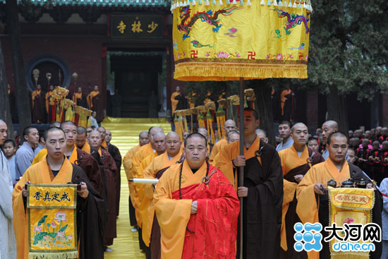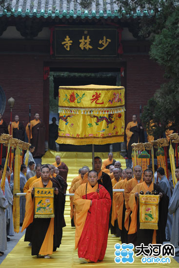 在少林寺山门前,随着山门大开,少林寺方丈释永信携众僧走出山门,迎接前来参加少林武术节的嘉宾。隆重的“九和归一”之后,众嘉宾随释永信方丈入寺参观。