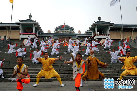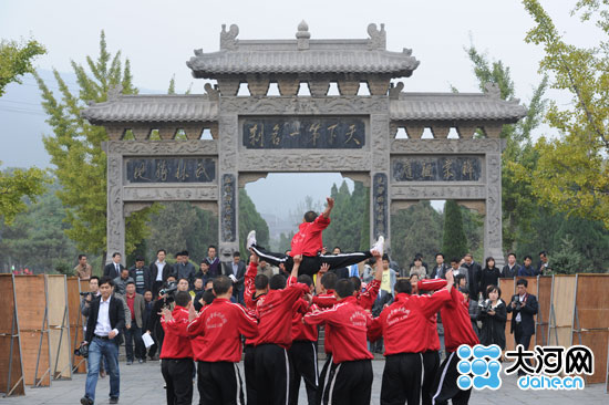 在少林寺景区内,塔沟武校的8000余名学员身着民族服、僧服和搏击服,分别表演梅花桩、铁沙掌、易筋经、飞檐走壁等传统的少林绝技,展示少林武术的博大精深,把整个彩排活动推向高潮。