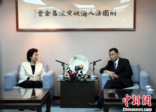 10月27日,大陆海协会副秘书长张胜林等抵达台湾,了解在台湾苏花公路失踪的20名大陆同胞的搜救进展情况。图为张胜林(左)下午会见海基会副董事长高孔廉。中新社记者 陈立宇 摄