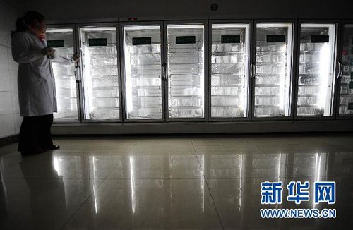 10月27日,云南昆明血液中心血库内空空荡荡的储存柜。截至2010年10月中旬,昆明血液中心的库存O型血仅2200毫升!一场“血荒”引发了前所未有的社会关注。新华社记者 秦晴 摄