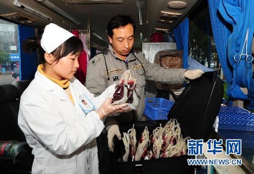 10月27日,云南昆明血液中心的工作人员将采集好的血液打包,准备送回中心检验。截至2010年10月中旬,昆明血液中心的库存O型血仅2200毫升!一场“血荒”引发了前所未有的社会关注。新华社记者 秦晴 摄