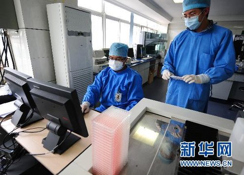 10月27日,云南昆明血液中心工作人员在对血液进行检验。截至2010年10月中旬,昆明血液中心的库存O型血仅2200毫升!一场“血荒”引发了前所未有的社会关注。新华社记者 秦晴 摄
