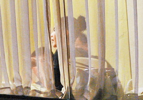 透过窗帘,可看见王菲(右)开心地和同桌友人聊天