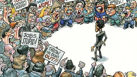让人感到奇怪的是,奥巴马没能感受到,更不用说应对中产阶级的怨愤,他还回避茶叶党人和持有异见的人。在竞选中口若悬河的奥巴马现在变得对这些苦楚充耳不闻。有人把这些归结于他艰难成长环境造成的情感缺失,也有人认为他受到了未完全开化的民主党的影响。无论什么原因,他似乎对美国的痛楚无动于衷;看起来既不能落实自己的新政,也没有绘制出乐观的前景。