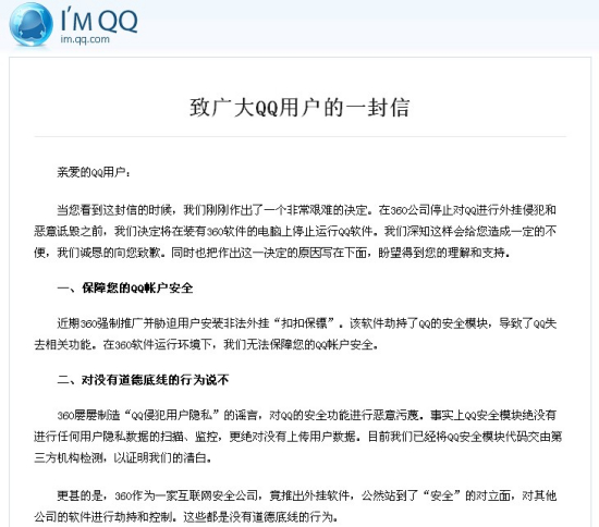 11月3日晚18:20左右,腾讯通过全国IM弹窗形式,向网友表达其刚刚做出的“艰难决定”:在360公司停止对QQ进行外挂侵犯和恶意诋毁之前,腾讯将在装有360软件的电脑上停止运行QQ。