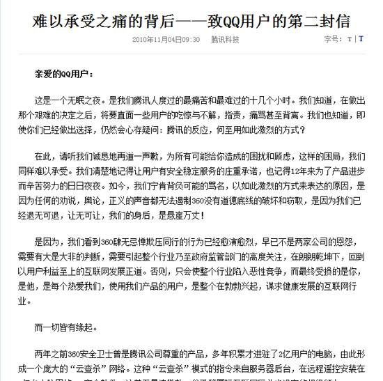 11月4日早间消息,腾讯公司今日对外发布致用户的第二封信,以“难以承受之痛的背后”为标题,以下为信件全文: