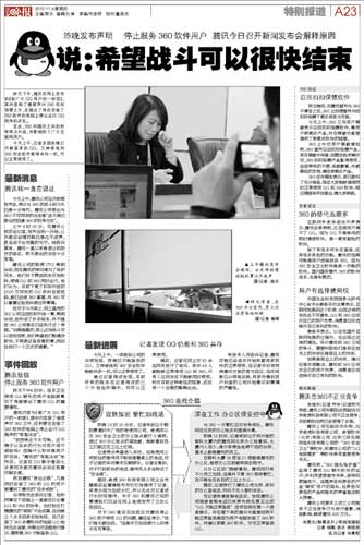 今天上午,腾讯公司召开新闻发布会,表示与360的战斗到今天已是十分惨烈。腾讯公司做出与360不可同存的决定是“迫不得已做出的回避360的抗争方法”。