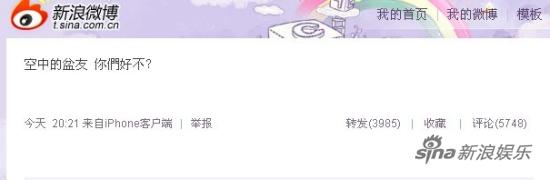 更有意思的是,在王菲的微博发出后不久,微博竟然无法登陆,网友纷纷表示不解,有网友戏言是由于天后的人气导致微博不堪重负。就连微博女王姚晨随后也发微博透露,“造型师Zing向我们‘控诉’:我快疯了,整个换妆时间就三十秒,阿菲竟然还能插空发微博,嘴里还嘟囔,咦,为什么发不上去?为什么啊?”