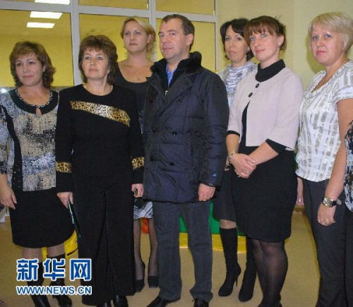 这张当地居民11月1日拍摄的照片显示,俄罗斯总统梅德韦杰夫(中)在南千岛群岛(日本称北方四岛)的国后岛上与当地的俄罗斯幼儿园教师合影。新华社/路透
