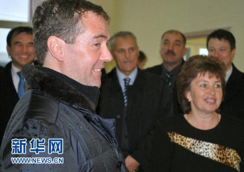 这张当地居民11月1日拍摄的照片显示,俄罗斯总统梅德韦杰夫(左)在南千岛群岛(日本称北方四岛)的国后岛上与当地一所俄罗斯幼儿园的员工交谈。新华社/路透