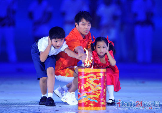11月12日,第16届亚洲运动会开幕式在广州海心沙岛举行。这是火炬手何冲(中)与儿童熊钰翔(左)、陈佳雨一起点燃引燃主火炬的中国传统炮竹。新华社记者刘大伟摄