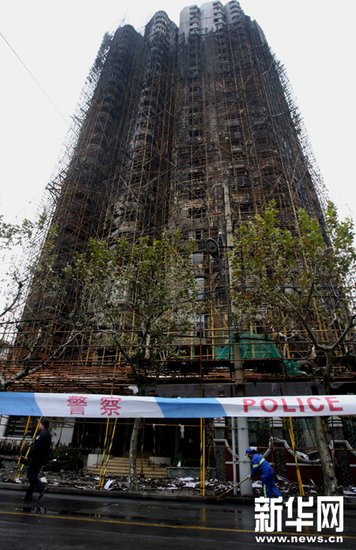 这是11月16日上午拍摄的上海胶州路发生特大火灾事故的高层住宅楼。新华社记者 刘颖摄