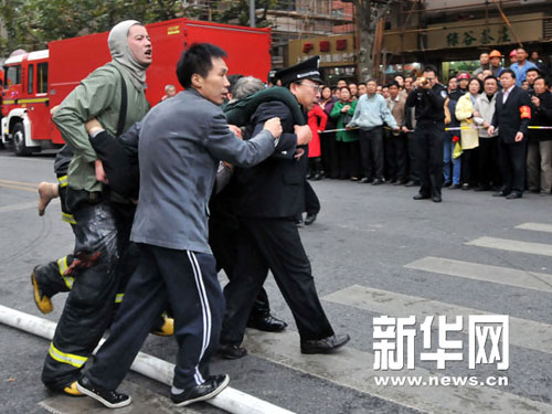 11月15日,一位居民从发生火灾的大楼被救出。新华社签约摄影师 董鸿景 摄
