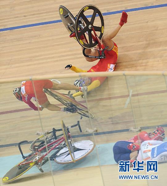 11月16日,中国选手汤科蓉(上)在比赛中摔倒,随后她因伤退出比赛。当日,第16届亚运会场地自行车女子计分赛发生了严重的车辆相撞导致车手摔倒的事故,几名选手因伤退出比赛。新华社记者李尕摄