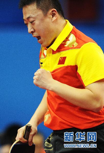 11月16日,中国选手马琳在比赛中庆祝得分。当日,在广州举行的第16届亚运会乒乓球男团决赛中,中国队以3比0战胜韩国队,夺得冠军。新华社记者徐家军摄