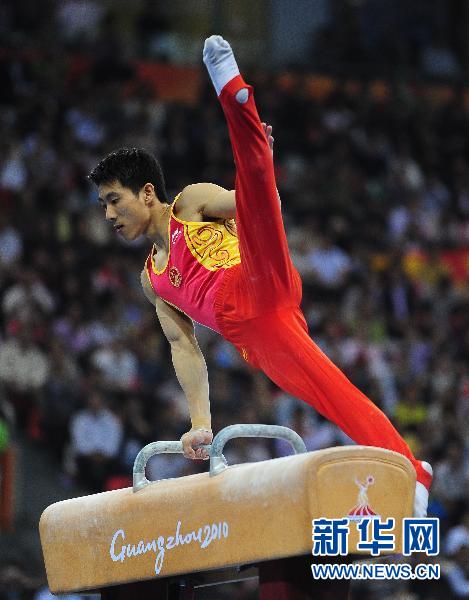 11月16日,中国选手滕海滨在鞍马比赛中。当日,在广州进行的第16届亚运会体操项目男子鞍马决赛中,中国选手滕海滨以15.375分夺得冠军。新华社记者卢汉欣摄