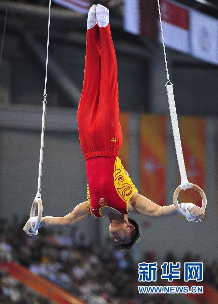 11月16日,中国选手陈一冰在比赛中。当日,在广州进行的第16届亚运会体操项目男子吊环决赛中,中国选手陈一冰以16.075分夺得冠军。新华社记者卢汉欣摄
