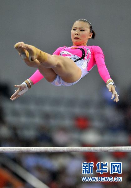 11月16日,中国选手何可欣在比赛中。当日,在广州进行的第16届亚运会体操项目女子高低杠决赛中,中国选手何可欣以16.425分的成绩获得金牌。新华社记者王雷摄