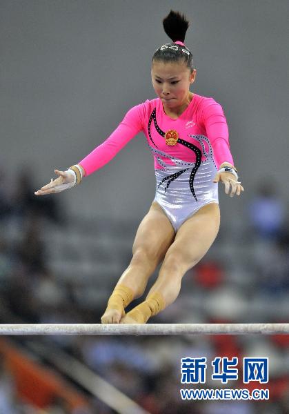 11月16日,中国选手何可欣在比赛中。当日,在广州进行的第16届亚运会体操项目女子高低杠决赛中,中国选手何可欣以16.425分的成绩获得金牌。新华社记者王雷摄