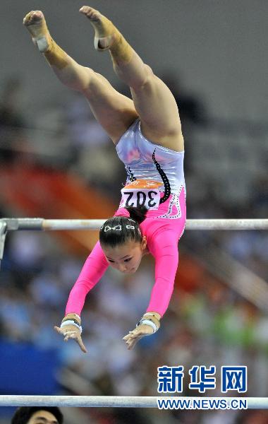 11月16日,中国选手何可欣在比赛中。当日,在广州进行的第16届亚运会体操项目女子高低杠决赛中,中国选手何可欣以16.425分的成绩获得金牌。新华社记者王雷摄