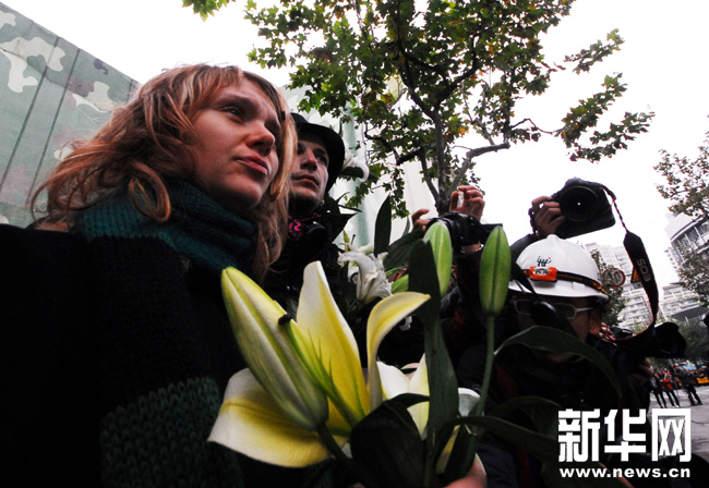 11月16日,一名来自俄罗斯的姑娘到上海胶州路特大火灾事故大楼前献花,为遇难者默哀。新华社签约摄影师 钮一新 摄