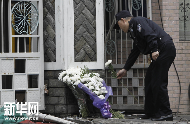 11月16日,一位警察正将菊花摆放在发生火灾的大楼入口处。新华社记者 裴鑫 摄